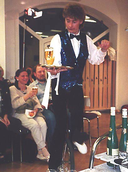 Timo, also from Ska's group, did a mad waiter act on a unicycle. His expression was particuarly fierce. He reminded me of waiters that I would prefer to avoid if I was having a gentle night out. My heart was in my mouth as he accelerated between the tables with full trays of drinks, or as he ascended a ladder, on his unicycle, blindfold. A hilarious act, which was worth every second spent away from contortion.