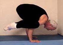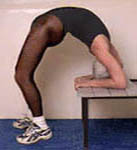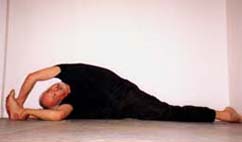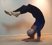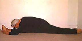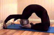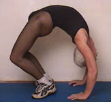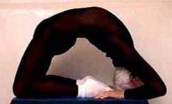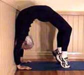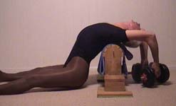 Experiments in ways to enhance the stretch: (1) Pressing the chest up against a wall, and pushing with the legs (though this tends to compress the lower back). (2) Using a low table and walking the legs in - this gives a wonderful tight curve in the upper back and shoulders. (3) Lying back over a support - there is no strain on the back because it is fully supported (at its tightest bend). The spine is lengthened in this position by holding on with the hands and using weights. Lengthening the spine is the secret to backbending.